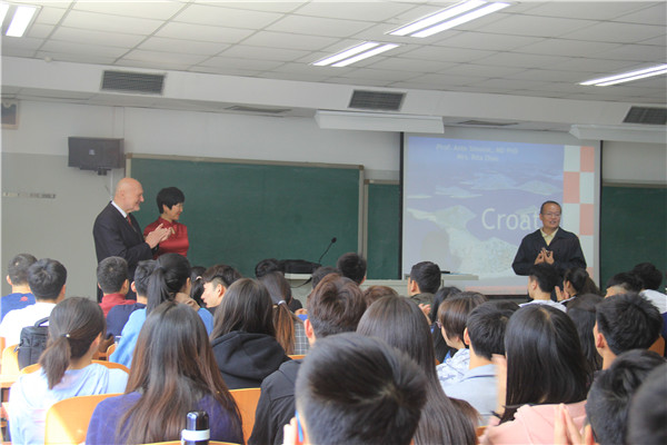 司马安教授用一句流利的中文“我是中国人”作为开场,引起了在场师生热烈的掌声。司马安教授通过诙谐幽默的语言,通过介绍克罗地亚的风土人情、发明创造、科学技术、历史文化等方面,多角度地向我们展示了克罗地亚这个极具魅力的美丽国度。克罗地亚共和国属于欧盟国家,地处中欧地中海的优良地位,拥有1000多个岛屿,有山有水有美景,诗情画意般宛若人间仙境,并由此克罗地亚的旅游业十分发达。司马安教授也向我们介绍了罗马时期和中世纪时期的克罗地亚。